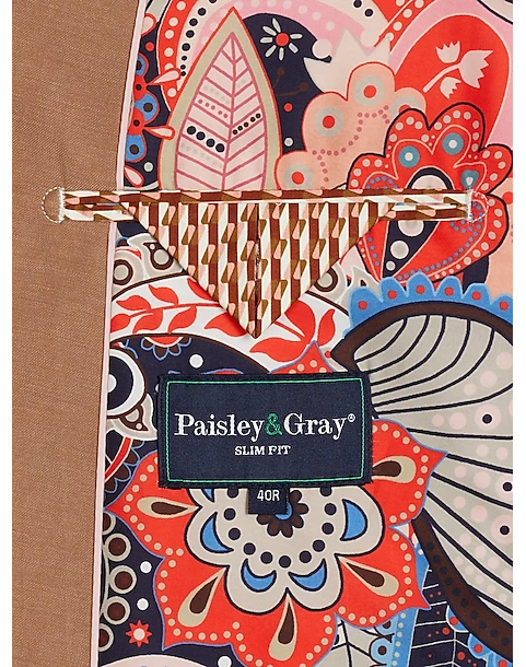 - 74% polyester 24% rayon 2% spandex|Two button|Peak lapel|Side vents|Coordinating pieces sold separately|Slim Fit|Paisley & Gray|