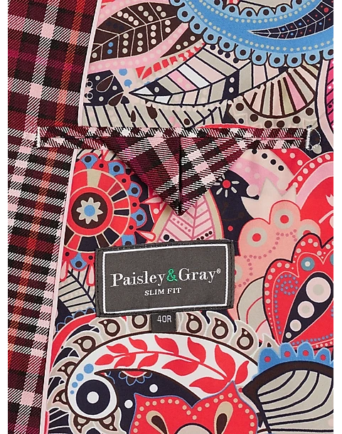 - 64% polyester 34% rayon 2% spandex|Two button|Notch lapel|Side vents|Coordinating pieces sold separately|Slim Fit|Paisley & Gray|